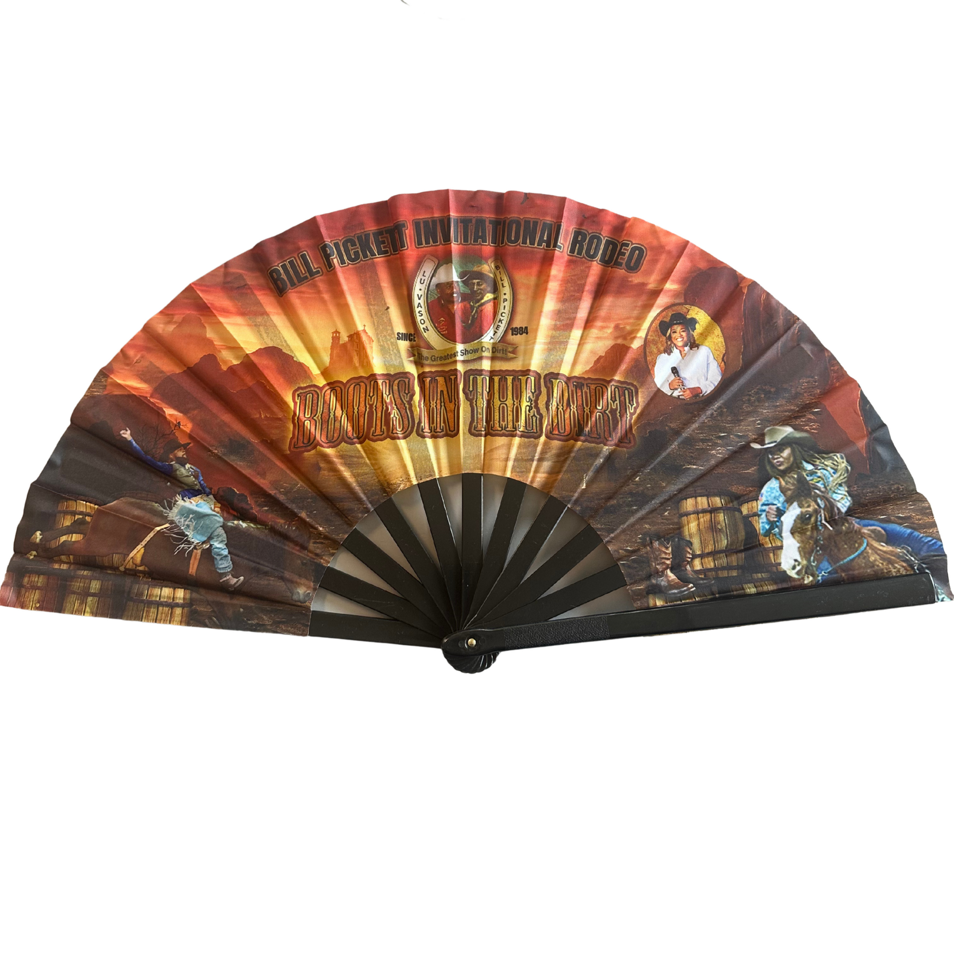 Heat rising? Snap open some rodeo attitude. This fan brings the action with a full-color BPIR design, cowboy grit, and the “Boots in the Dirt” legacy front and center. It’s loud, proud, and made to be seen.