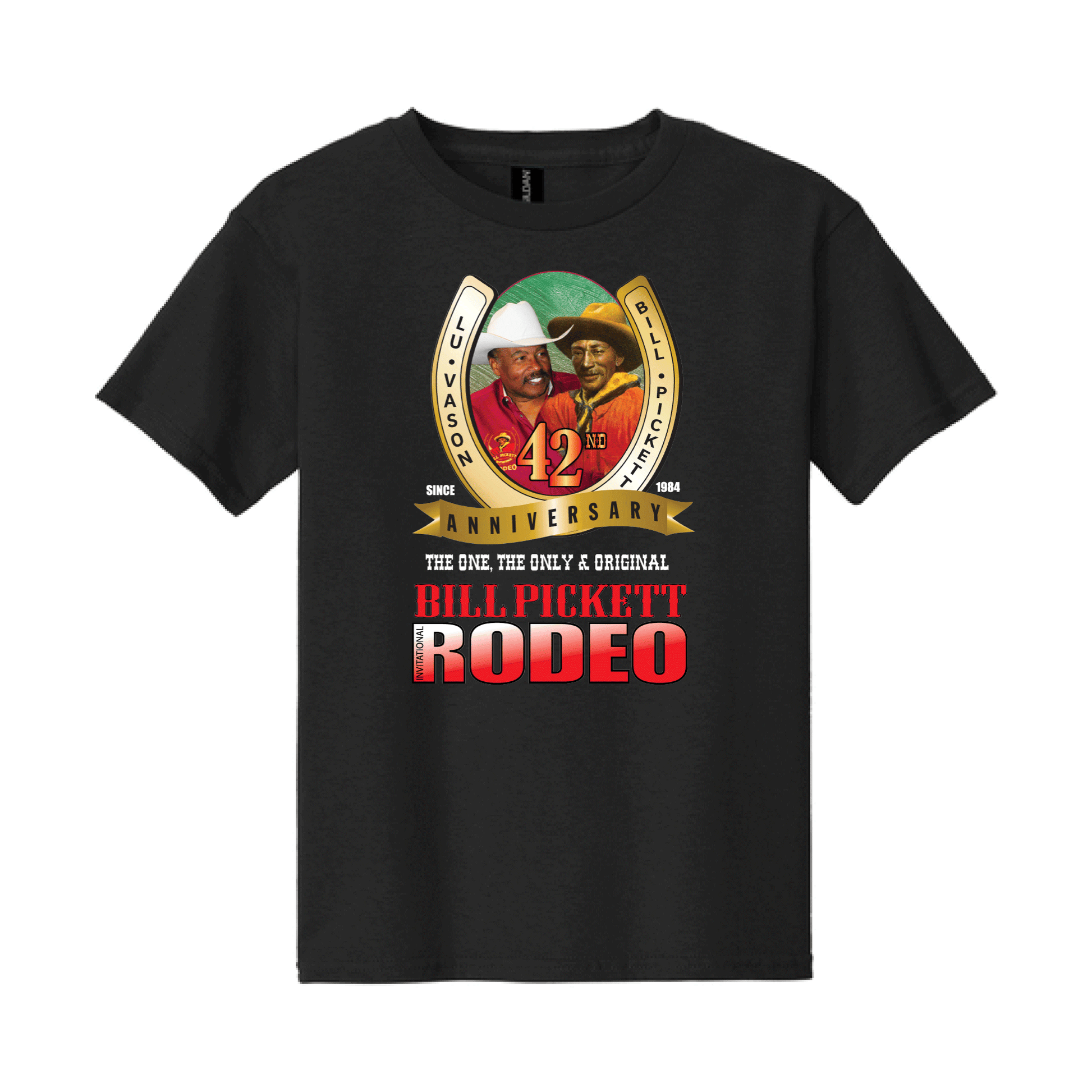 Show your pride and respect for 42 years of Bill Picket Invitational Rodeo with this commemorative t-shirt. Made from sustainably and fairly grown USA cotton, these classic-fit tees are available in 3 different colors with the Bill Pickett logo displayed proudly on the front with "The Greatest Show on Dirt" on the back.
